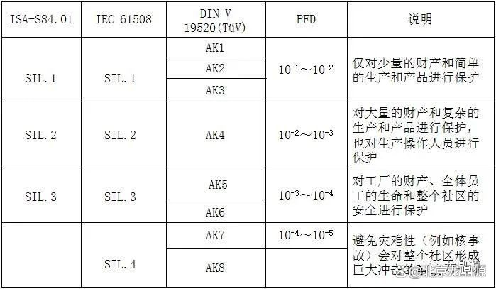 Theo tiêu chuẩn IEC, nó được chia thành SIL1-SIL4 từ thấp đến cao, SIL1-SIL3 từ ISA 84.01 và AK1-AI8 từ thấp đến cao theo DIN V VDE0804. Mối quan hệ tương ứng giữa chúng như sau.